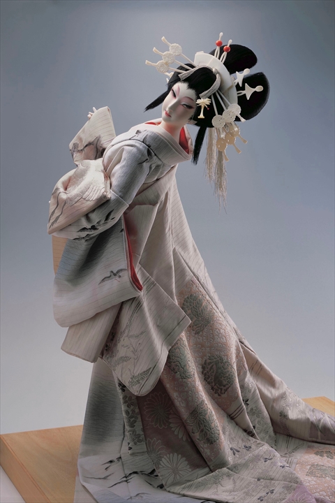 横兵庫は江戸の太夫の髪型で上級の遊女が結っていました。夏の花魁なので髪飾りは白にしています。十五夜の月までには帰ると約束したのに……もうあれから三度目の月、せめて十四番目の月までにはと苛立つ女心が見えるようです。焦がれ待つ女の切なさを振り返った背中で表し、月光の中に立つ哀れさを"小袖""打掛""帯"の抑えた色調と髪飾りの白で表現してみました。